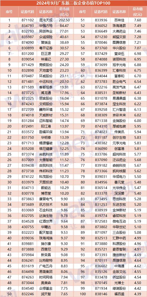 2024年9月广东新三板企业市值TOP100:27家企业冲击北交所