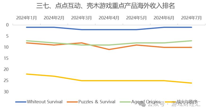 点点互动推出的《Whiteout Survival》稳居榜单前二,三七互娱的《Puzzles & Survival》和壳木游戏的《Age of Origins》排名不相上下,基本保持在前十名的位置,壳木游戏的另一款产品《战火与秩序》也稳居榜单前30名。