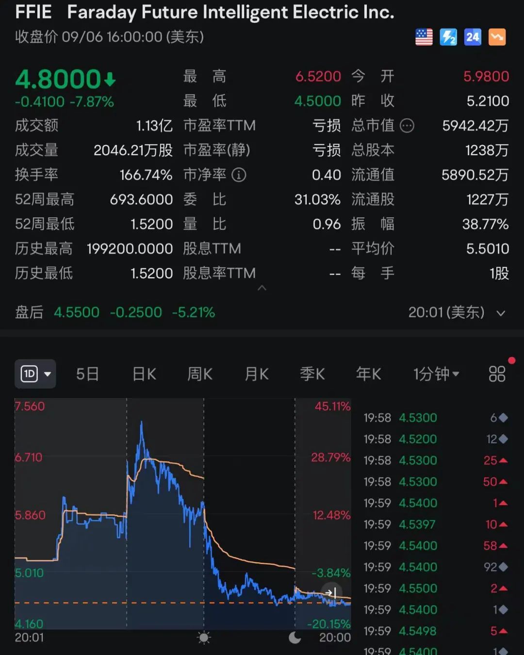 当地时间9月4日收盘,FF报5.24美元/股。截至当地时间9月6日,FF跌7.87%,股价报4.8美元。
