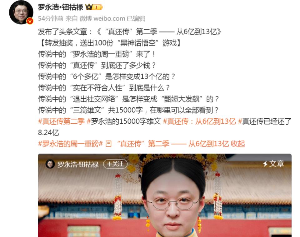 真还传1.0的目标是6个亿。罗永浩在近期的微博中透露,已经超额完成,还了8.24亿。但由于债务有新增,他现在回归互联网的目标就是尽快还清剩下的5个多亿的债务。当然,估计部分原因还有他的AR创业企业细红线进展得没那么顺利。