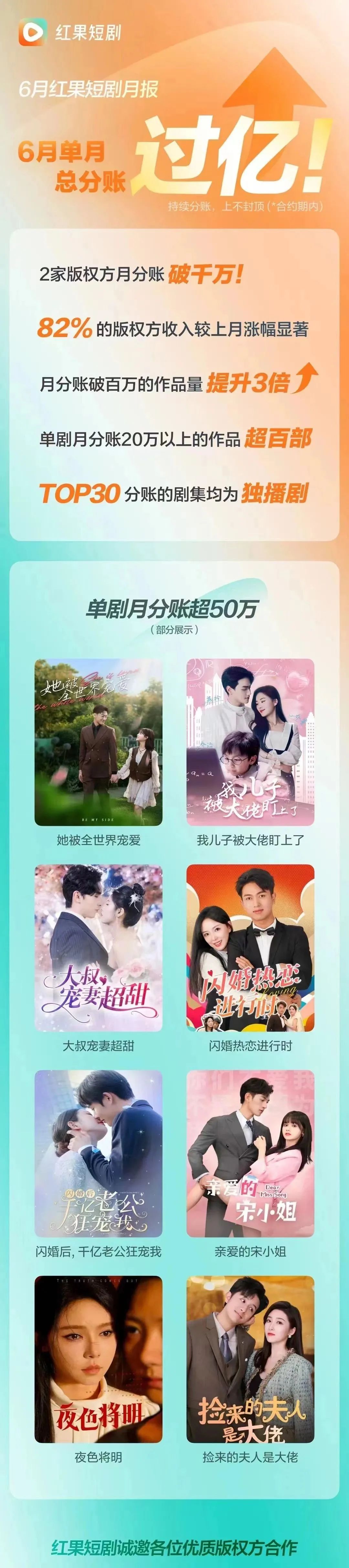 更让人意想不到的则是IAA模式,主打此模式的红果短剧目前DAU已经突破3000万,用一部数十万的保底模式笼络了行业绝大多数产能,7月单版权总分账就破了亿元,明年更是喊出了DAU破亿的目标。