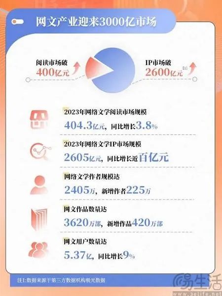 根据中国作家协会今年春季发布的《2023中国网络文学蓝皮书》显示,截至2023年年底,我国网络文学阅读市场规模达404.3亿、同比增长3.8%,网文用户数量达5.37亿、同比增长9%。