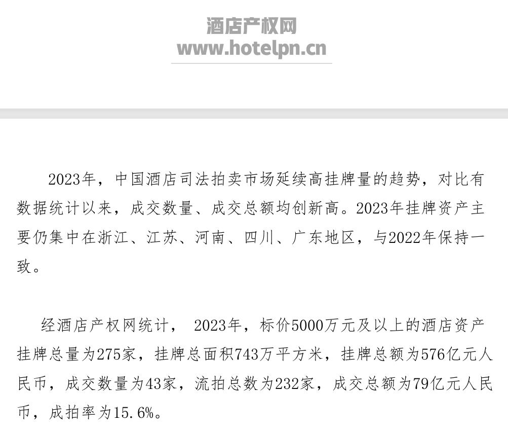 可以从近两年法拍酒店相关情况看出一些端倪。根据酒店产权网统计,2023年标价5000万元及以上被法拍的酒店资产挂牌总量为275家,2022年则为194家,体量规模持续上涨;但从成交情况看,2023年完成交易的仅为43家,成拍率为15.6%,2022年更低,仅成交16家,成拍率为8.2%。