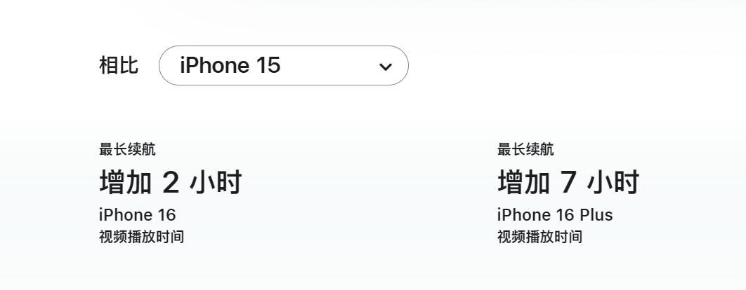 第三,苹果优化了A18的功耗,并宣称续航得到了“大幅提升”。但苹果没告诉你,大幅到底是多大呢,iPhone 16的电池容量与上一代相比几乎持平。事实上,对比iPhone 15,iPhone 16的视频续航只是从20小时到22小时,增加了2小时,iPhone 16 Plus对比15 Plus只是增加了1小时。真是够大呢!