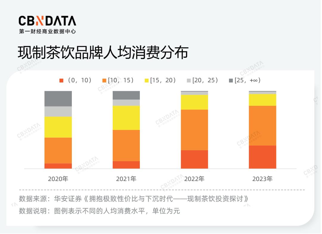 在卷颜值、卷原料品质、卷健康度等招式后,茶饮行业的产品竞争来到最朴素的卷价格阶段。从30元时代到20元时代,再到如今厮杀10元以下价格带,本质上是品牌对性价比消费理念的回应。华安证券研报数据显示,过去几年,茶饮行业10元以下人均消费占比从7%提升到30%,而20元以上占比从33%降至4%。