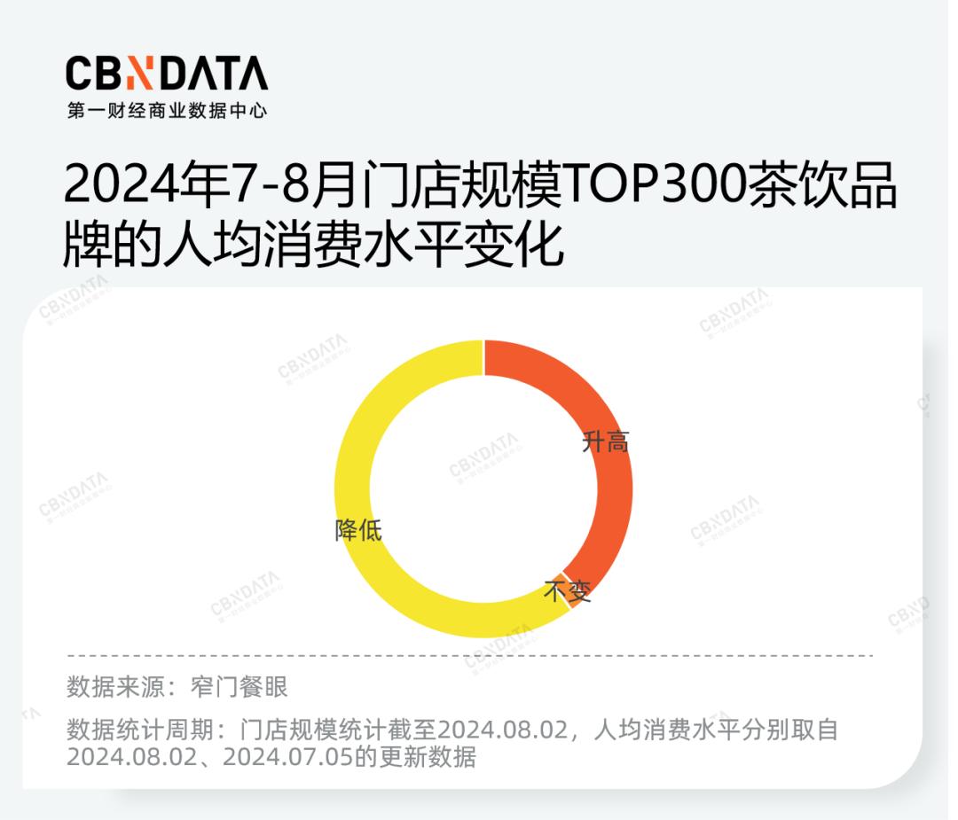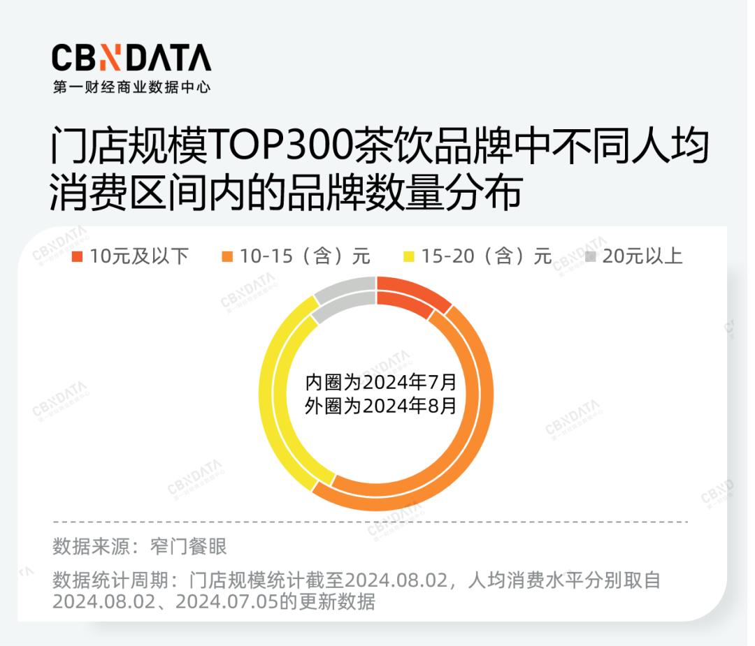 跳出个例视角,数据也证明了茶饮品牌在进一步下探至更低价格带。窄门餐眼数据显示,从7月初到8月初,门店规模TOP300茶饮品牌中,60%品牌的人均消费水平有所下降,包括蜜雪冰城、古茗、茶百道、沪上阿姨、书亦烧仙草、益禾堂等头部连锁品牌。人均消费水平在10元以下的品牌数量,则由29个增加至34个。