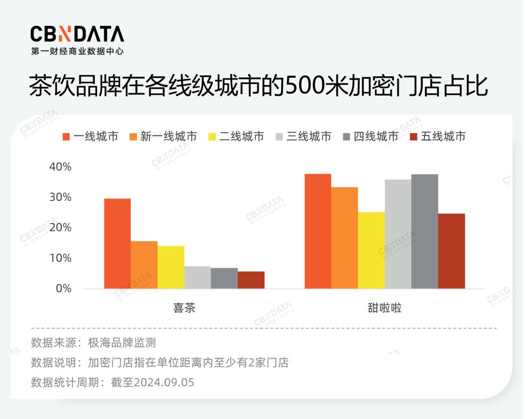值得注意的是,三个品牌均已完成对一线、新一线城市的100%覆盖。这意味着,喜茶、甜啦啦在一线城市的增量,很大程度上来自于门店加密。根据极海品牌监测数据,喜茶、甜啦啦在一线城市的500米内加密门店占比分别约为30%、38%。但喜茶在一线城市的门店规模已经达到900多家,门店加密更类似一种“防御”,即以灵活的店型、多元的选址覆盖更多的消费者,减少顾客流失率;甜啦啦在一线城市的加密更倾向于“进攻”动作,原因在于其以平价形象发源于低线市场,走“村镇包围城市”路线,目前在一线城市的门店数量刚刚突破60家,需要先以临近门店验证在一线城市的选址模型、运营策略,再逐步铺开。