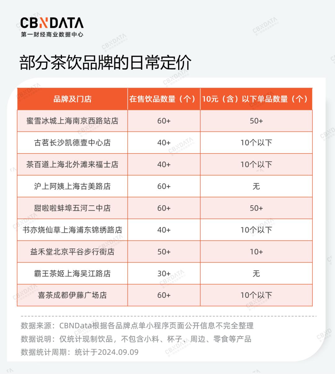 在日常经营中,品牌也往往会以类似举措来实现更可持续的低价,而非简单粗暴的“9块9”定价。CBNData查看了部分头部茶饮品牌点单小程序的常规门店菜单,发现在新品促销、“秋一杯”大战等节点结束后,除蜜雪冰城、甜啦啦外,品牌菜单中10元以下单品已不多见。