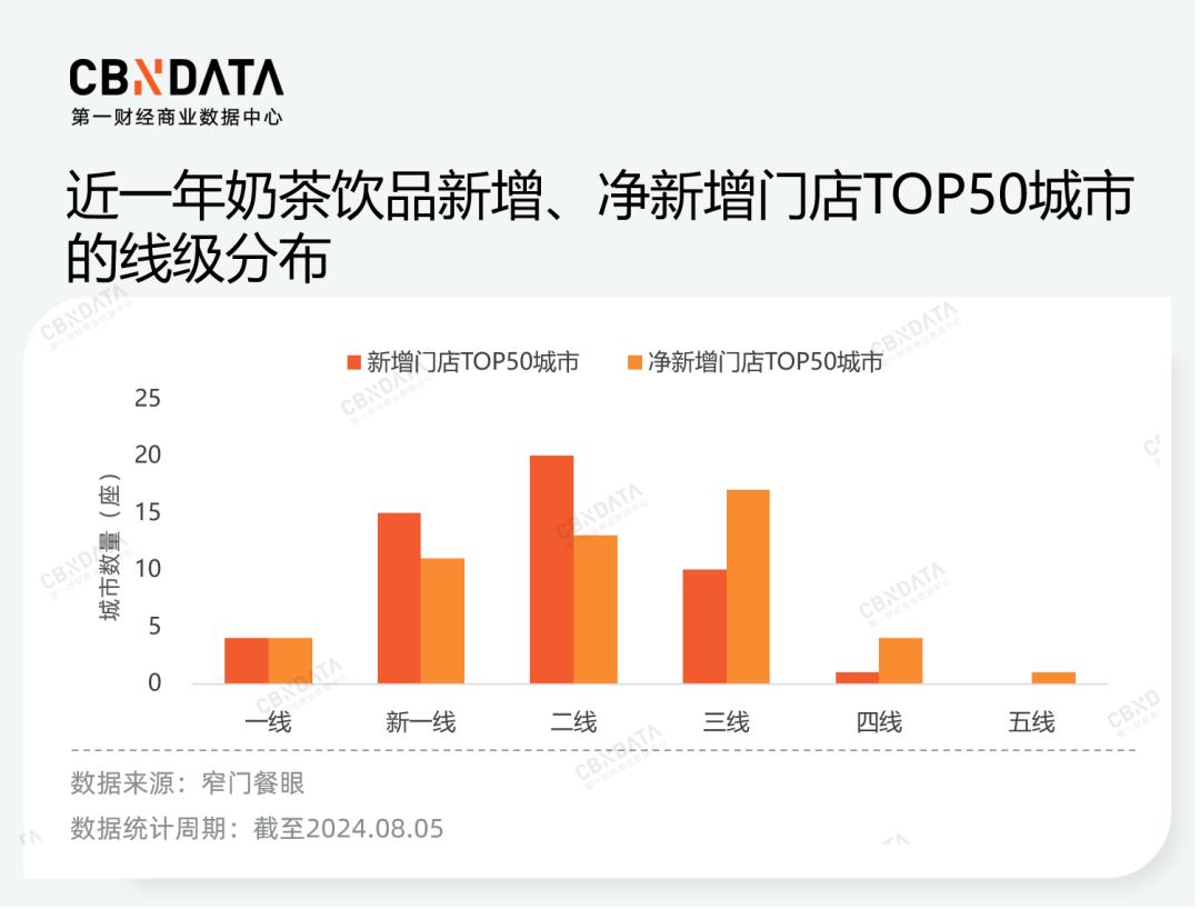 品牌们发力下沉的共同路线之下,三线及以下城市贡献了重要的门店数增量,且门店净新增表现显著优于一二线城市,显示出相对较强的开店活力。窄门餐眼数据显示,截至8月5日的一年内,4座一线城市、15座新一线城市全部进入新增门店TOP50城市;但在净新增维度,部分新一线、二线城市被三四线城市取代。