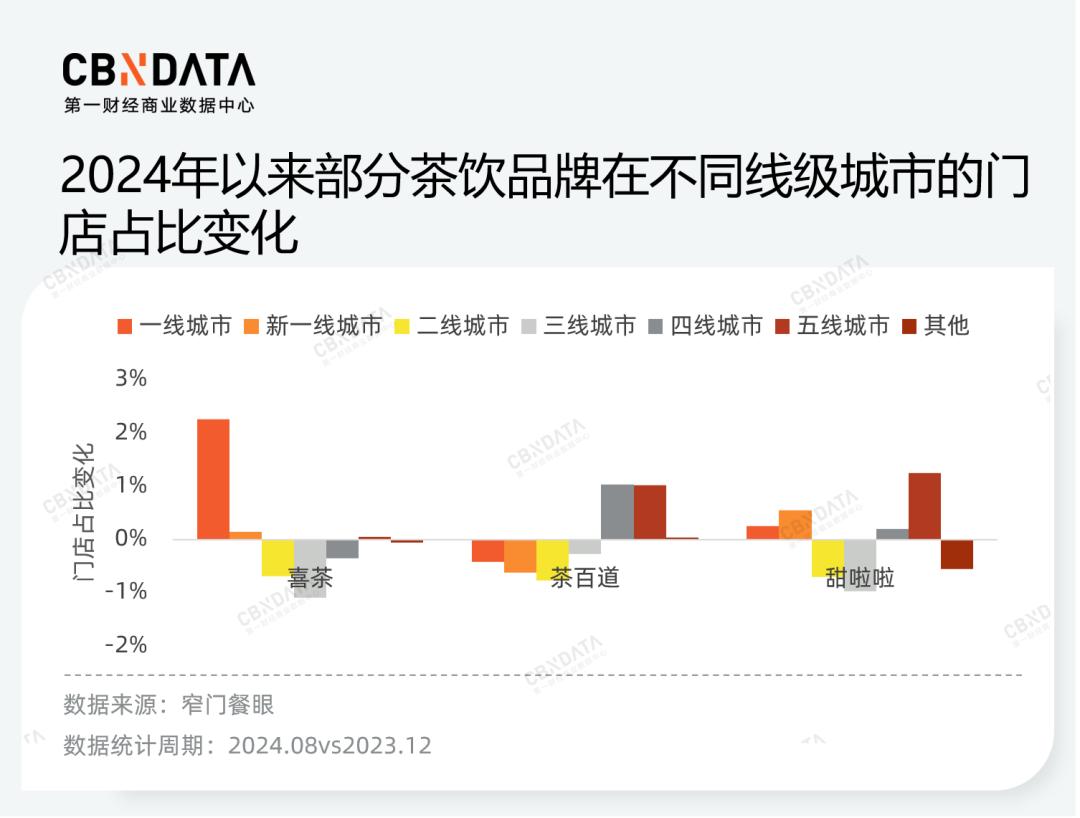 从城市线级的角度看,根据窄门餐眼数据,2024年品牌们均在增加对五线城市的布局,向着更下沉的区域迈进。区别在于,喜茶、甜啦啦的门店增量来源中,高线城市仍占据重要比重,而茶百道则更加专注于四五线下沉市场。