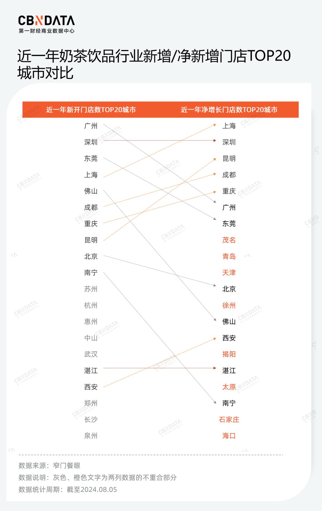 具体到TOP20城市,这一特点有着更明显的体现。相比新开门店数,一二线城市的净新增门店数排名普遍有所下滑,茂名、揭阳、湛江等低线城市的门店数净增长则相对坚挺。分区域来看,南方城市饮茶文化与茶饮原料基础深厚,几乎包揽门店新增量TOP20城市,但其竞争也更为激烈,门店净新增排名下降明显,不少北方城市反而冲出重围,跃居门店净增长TOP20名单。