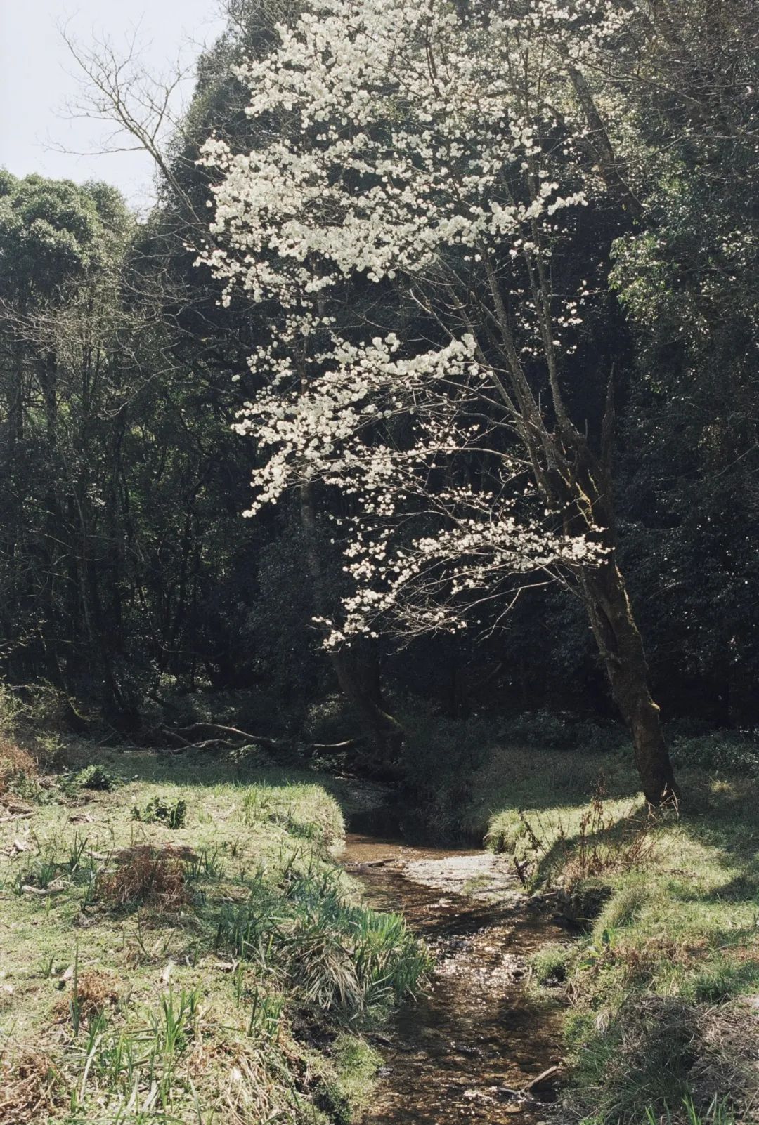 好在,去往找寻滇山茶花的路上,有一处山谷,称得上是现代版的“世外桃源”。一株高大的白樱桃树下,小溪潺潺流淌,水边只有蜜蜂与蝴蝶在啜饮。风一吹,花瓣成片掉落,一场无声的、无人的樱吹雪。