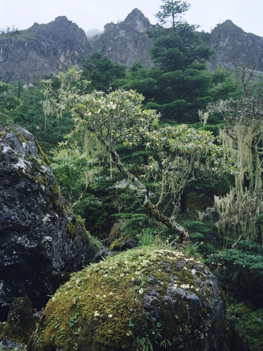从石子路往上走,穿过高山草甸,来到马缨杜鹃树下,可以看见花瓣与树木的肌理。穿过少许游人,就可以获得独处于自然之中的清净。天朗气清时,杜鹃投下花影,远方白云缓缓飘过,时间在此刻宛若静止。