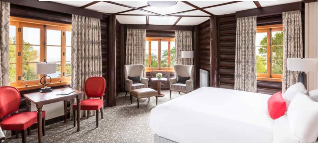 这座建筑就是蒙德贝罗城堡酒店(Fairmont Le Château Montebello),它有200间多间客房,一个高尔夫球场,数十公里长的滑雪和雪地摩托车道。除此之外,它还拥有一个26000公顷的自然保护区。建造这座酒店耗费了一万多棵昂贵的红雪松,入住这里的客人也都非富即贵,美国总统、英国首相也都曾在这里下榻。