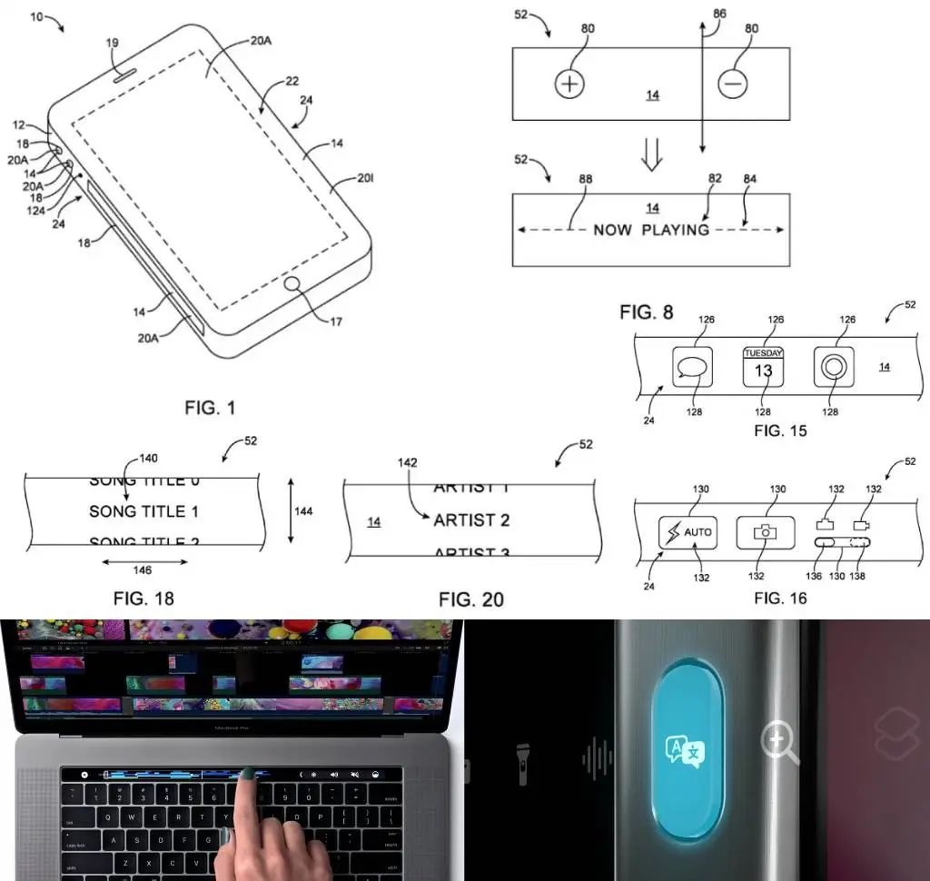 苹果有一项适用于 iPhone 上的专利,是把侧面按键做成触屏,在操作按键的同时,就能显示对应的信息。比如打开音乐时,触屏就会变成播放器样式,打开日历时,则可以显示日程——苹果并不是没有这样设计的先例,上一代 MacBook Pro 的 Touch Bar 设计让人印象深刻,而操作按钮的设置界面,也揭示了这颗按钮要发挥其功能,视觉信息是必备的一环,但在目前的 iPhone 上,这项能力是缺位的。