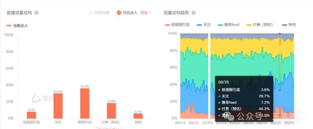 近90天的直播流量结构显示,预估其付费流量占比约为18.8%。其中,8月25日,付费流量占比达到了46.3%。