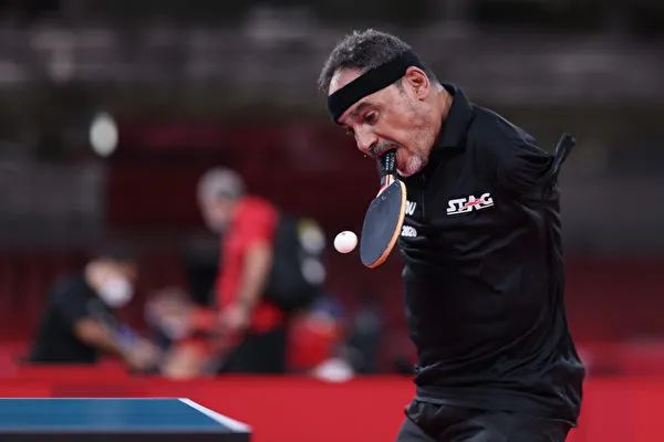 如来自埃及的乒乓球选手Ibrahim Hamadtou,他是一名双臂截肢者,从2016年在里约残奥会上首次亮相,他一直是用嘴巴含着乒乓球拍,用右脚发球,一路比赛至今。