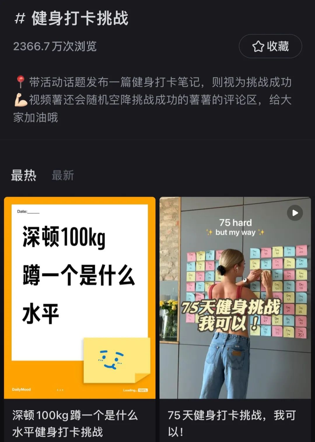 尤其在社交媒体上,各种打卡挑战的背后,许多参与者都表达了对现状的不满,渴望为自己的拖延和怠惰找一些动力。目前,在小红书上关于 #健身打卡挑战 的相关帖子浏览量已经高达2365.2万次。