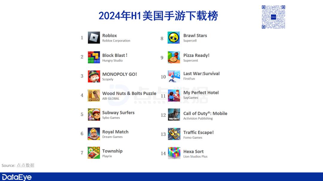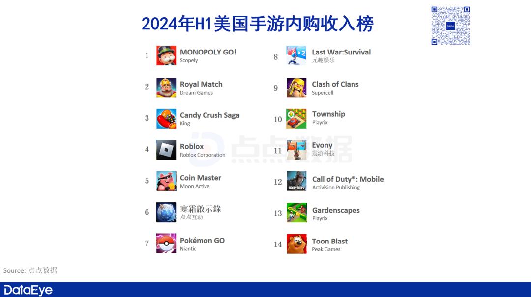 美国收入榜整体上依旧由《Candy Crush Saga》《Roblox》《Pokémon》等老牌游戏占领,这些产品均已达到高度成熟的阶段。