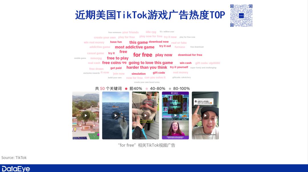 2024年5-9月,美国TikTok高热度游戏广告关联文案主要围绕着简单粗暴的吸引点,热度最高的是for free,其次有play now、going to love this game、most additive game等。