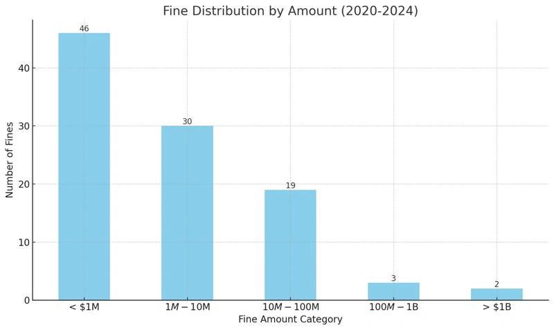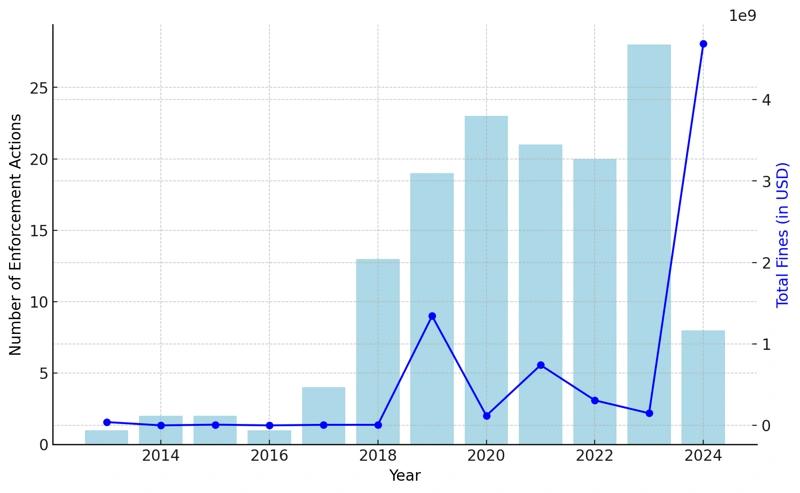 据统计,2018 年,平均罚款金额仅为 339 万美元,到 2024 年这一数字则已上升至平均 4.26 亿美元,增长了 12466.37% 。