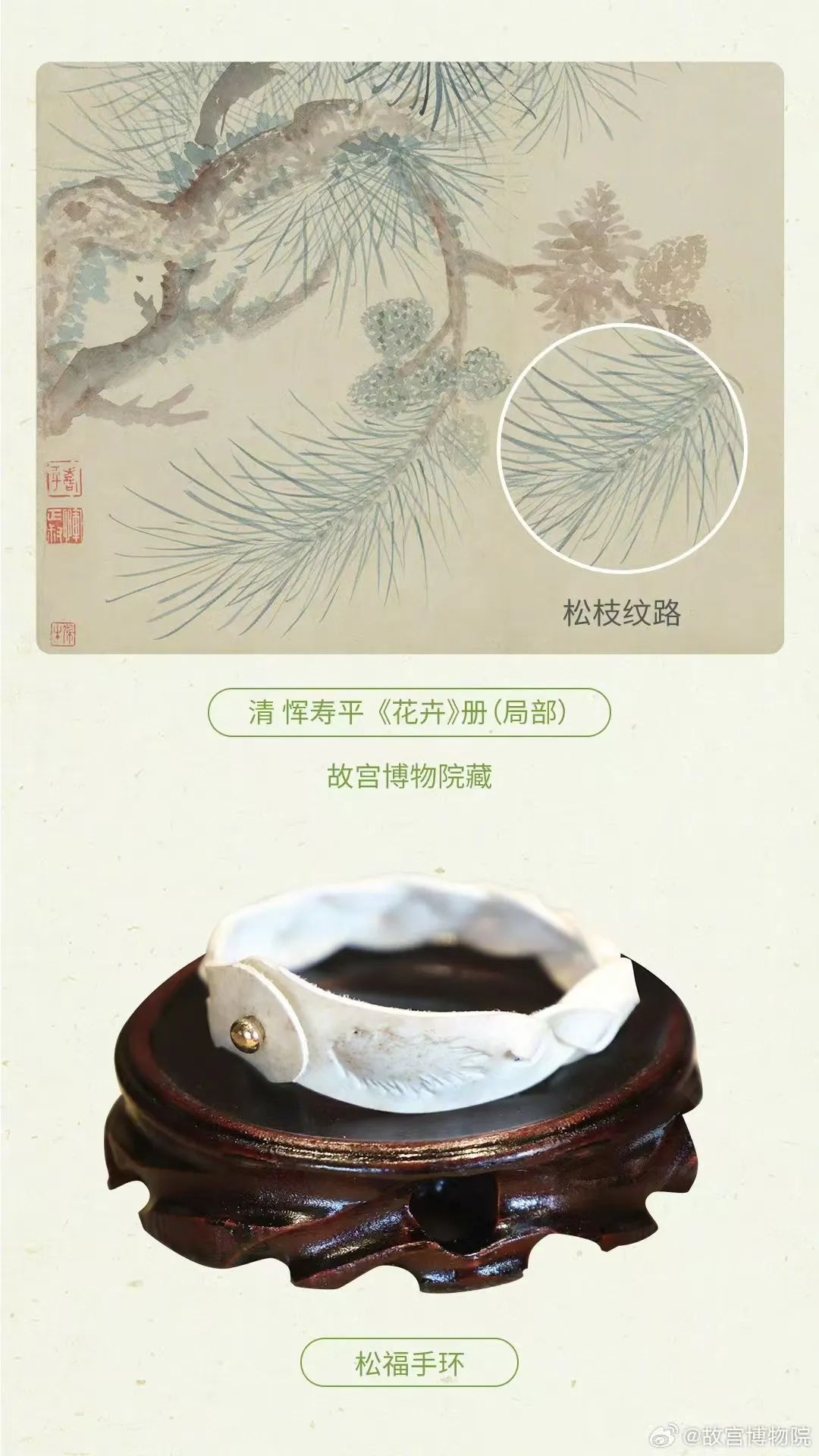 在今年3月份国际零废物日上新的“松福手环”,就是将故宫的落叶作为发酵原料,通过处理制成生物基皮革,经剪裁和人工编织成手环,融入故宫院藏《恽寿平花卉册》中的松枝图案,才匠造而成的极具中式美学的时尚单品。