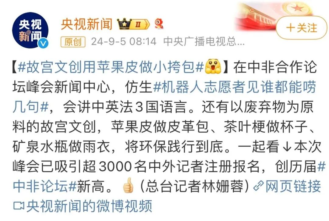 用苹果皮做皮革包、茶叶梗做杯子、矿泉水瓶做雨衣……在近期的中非合作论坛峰会上,#故宫文创用苹果皮做小挎包话题频登热搜,故宫文创产品又小火了一把。