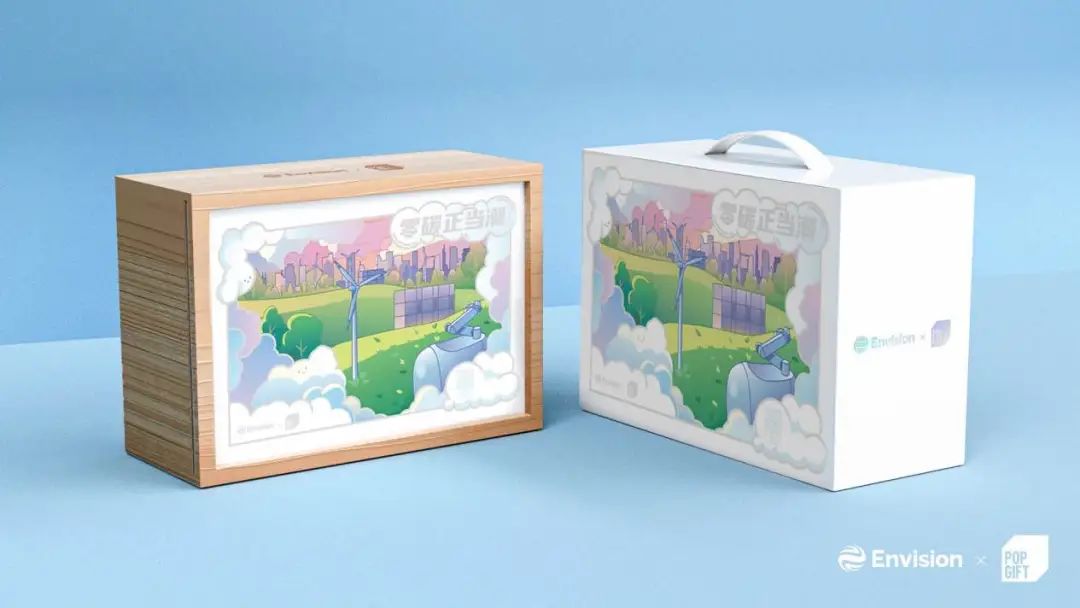 而在今年,泡泡玛特文创礼物POP GIFT与远景科技的合作再进一步——6月份推出了“零碳正当潮”碳中和文创礼盒。
