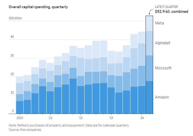 图注1:亚马逊、微软、Alphabet和Meta的季度资本支出情况,第二季度四大巨头共花费500多亿美元
