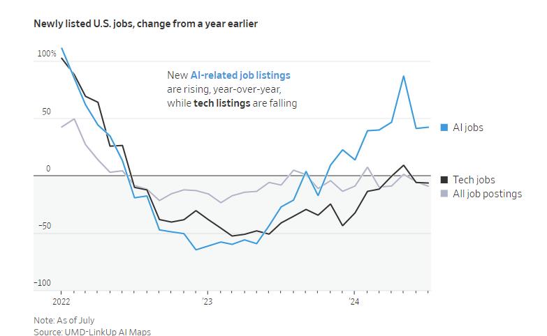 即便是掌握机器学习基础知识的专业人才,也能轻松获得六位数的薪资岗位。值得注意的是,与去年同期相比,7月份人工智能相关职位的新增招聘量激增近50%,与同期科技行业整体招聘略有下滑的趋势形成鲜明对比,凸显了市场对人工智能人才的高度渴求。