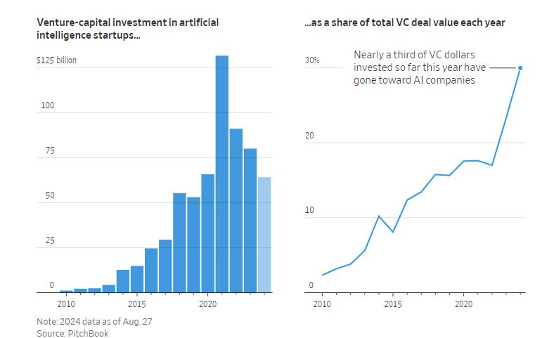 图注2:左图为人工智能初创公司每年获得的风险投资,右图为这类投资占风险投资总额的比例。2024年迄今,约1/3风险投资流向了人工智能公司