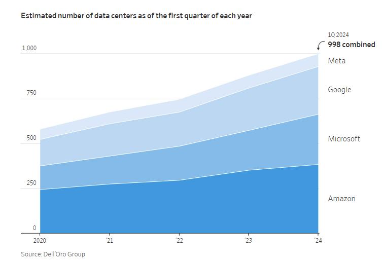 图注3:截至2024年第一季度,Meta、谷歌、微软和亚马逊的数据中心数量预计接近1000个