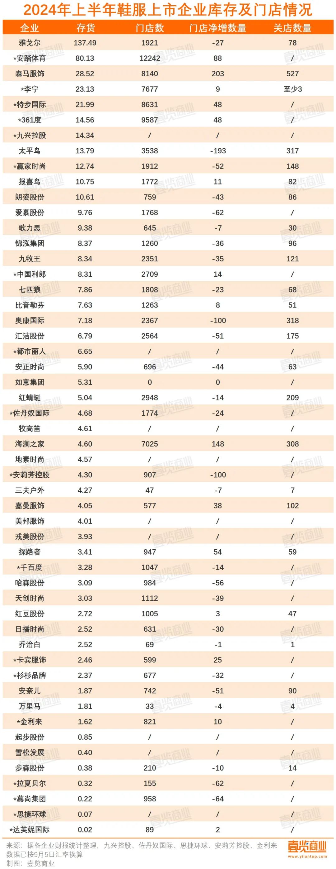 聚焦今年上半年,鞋服行业的库存表现依然承压。52家鞋服企业存货量达536.55亿,平均每家企业的存货达10.32亿,这个数字甚至已经超过了24家企业的上半年营收数据。