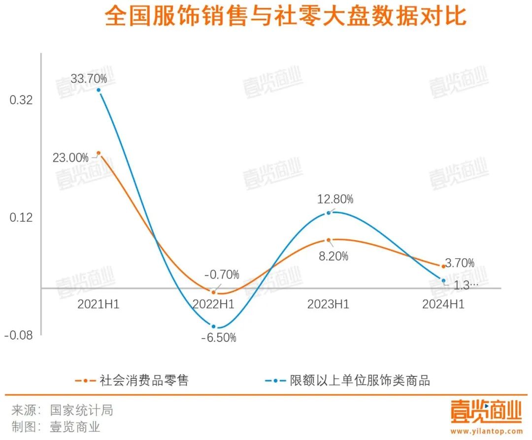 国家统计局数据显示,上半年社会消费品零售总额同比增长3.7%,限额以上单位服装、鞋帽、针纺织品类商品的零售额同比增长1.3%,增速整体低于平均水平,且比 2023 年全年放缓 11.6个百分点。