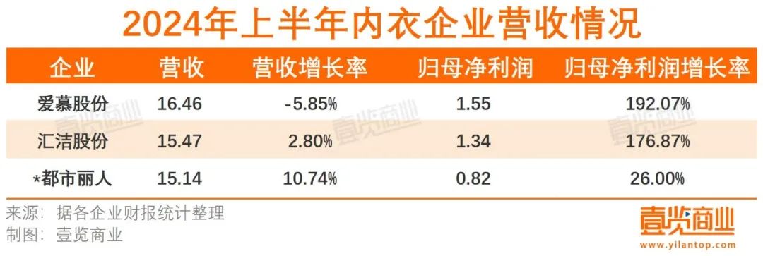 从内衣品类看,表现不容乐观。占据较高市场份额的爱慕股份上半年营收同比下滑5.85%至16.46亿元,是其2021年上市以来同期最低水平;曼妮芬的母公司汇洁股份上半年营收虽小幅增长2.80%至15.47亿元,但归母净利润同比下滑24.18%至1.34亿元;都市丽人稍显表现亮眼,营收、净利双双增长,归母净利润增速超200%。