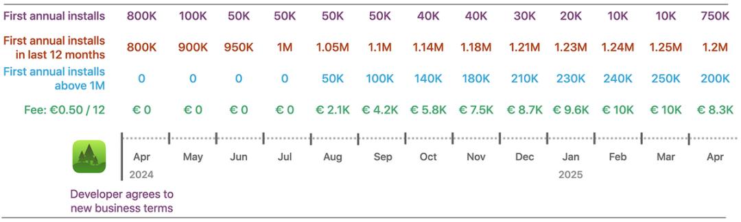 d. 但选择采用新规则,需要对12个月周期内首次安装量超过100万次的部分,按照每次0.5欧元进行收取核心技术费(Core technology fee)。