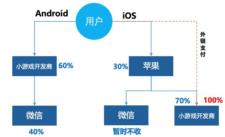 这样微信在iOS端小程序游戏上再相对应的收取5%~10%的分成,对小游戏开发商来说,整体渠道分销成本30%没有变化。