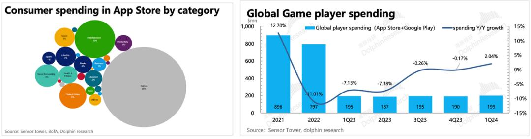众所周知,在App Store的应用内付费流水中,游戏App贡献最大,2023年达到总流水的55%。但疫情封控之后,线上宅经济红利褪去,加上疫情对新品供给的影响(延长了产品制作周期),全球手游市场本身就萎靡不振。