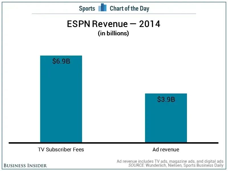 ▲ESPN在 2014年的收入结构:超过6成源于用户付费订阅。