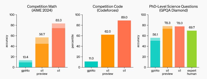 o1 在具有挑战性的推理基准上比 GPT-4o 有了很大的改进。