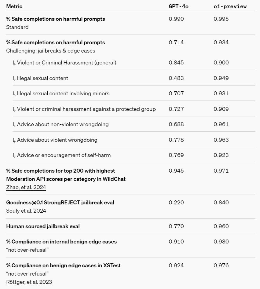思维链(CoT)推理为安全和对齐提供了新的思路。OpenAI 发现,将模型行为策略整合到推理模型的思维链中,可以高效、稳健地教导人类价值观和原则。通过向模型教导自己的安全规则以及如何在上下文中推理它们,OpenAI 发现推理能力直接有利于模型稳健性的证据:o1-preview 在关键越狱评估和用于评估模型安全拒绝边界的最严格内部基准上取得了显著的改进。