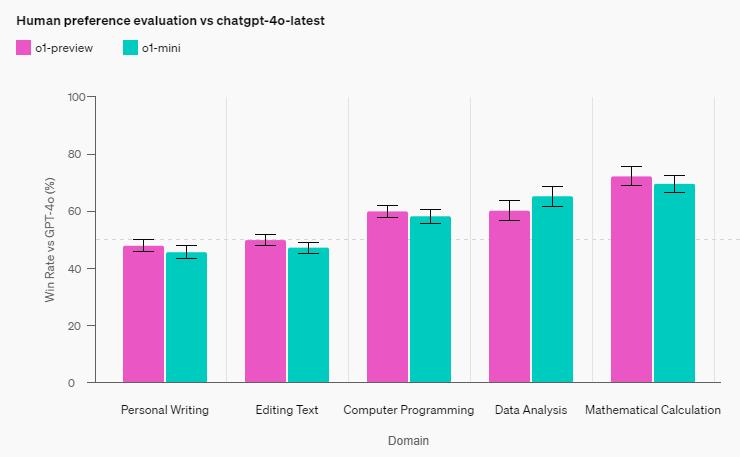 除了考试和学术基准之外,OpenAI 还在更多领域的具有挑战性的开放式提示上评估了人类对 o1-preview 和 GPT-4o 的偏好。
