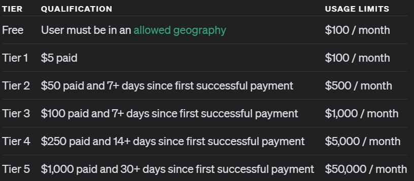 至于通过 API 访问的用户,OpenAI 表示达到了 5 级 API 使用量的开发者可以即刻开始使用这两个模型开始开发应用原型,但同样也被限了速:20 RPM。什么是 5 级 API 使用量?简单来说,就是已经消费了 1000 美元以上并且已经是超过 1 个月的付费用户。请看下图: