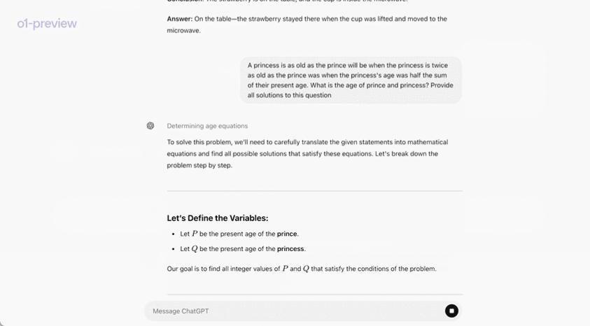 在一个官方演示中,o1-preview 解答了一个非常困难的推理问题:当公主的年龄是王子的两倍时,公主的年龄与王子一样大,而公主的年龄是他们现在年龄总和的一半。王子和公主的年龄是多少?提供这个问题的所有解。