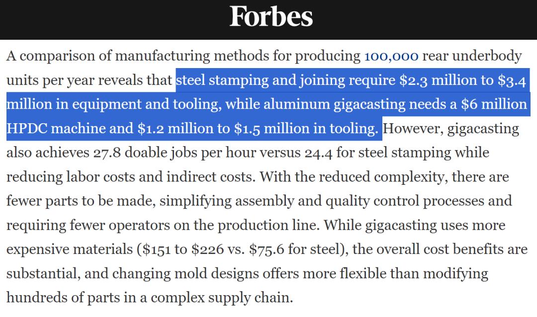 福布斯就曾经做过一个统计,同样是生产 10 万个后地板的总成,之前先冲压再焊接的工艺大概需要 230~340 万美元的产线成本。而在换成一体式压铸之后,光是压铸机本身就得花掉 600 万美元,还得再加上 120~150 万美元的其他产线成本。