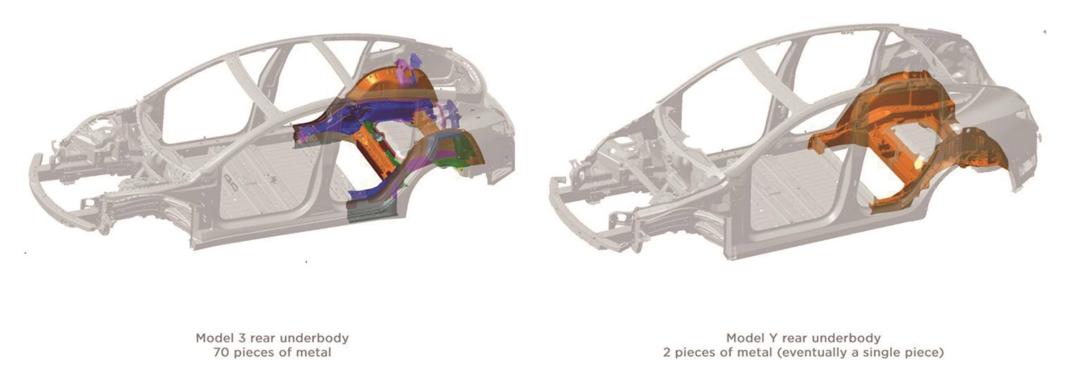 这个概念,是几年前特斯拉在发布 Model Y 的时候第一次提出来的。当时马斯克表示,造车的时候用上大压铸,车身成本减少两成以上,研发周期从三年缩短到 18 个月,还能大大节约工厂场地,减少工人数量。
