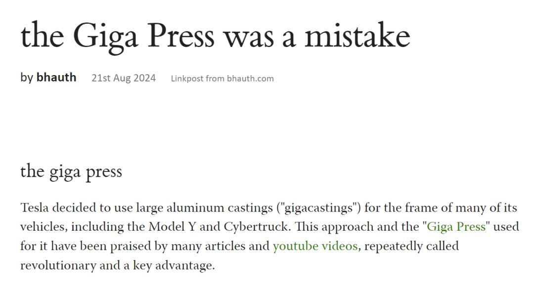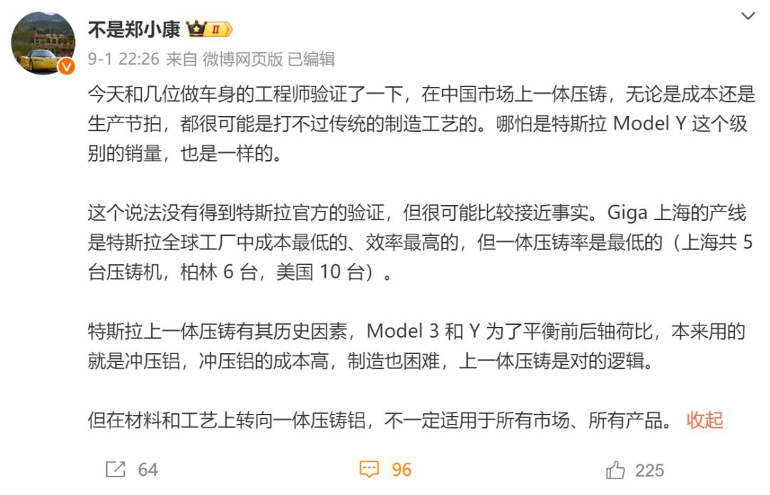 也因此啊,前几天有汽车行业的博主爆料,说特斯拉上海工厂的工程师也表示,即使是在 Model Y 这个全球销冠的身上,一体式压铸也没有表现出太大的成本优势。