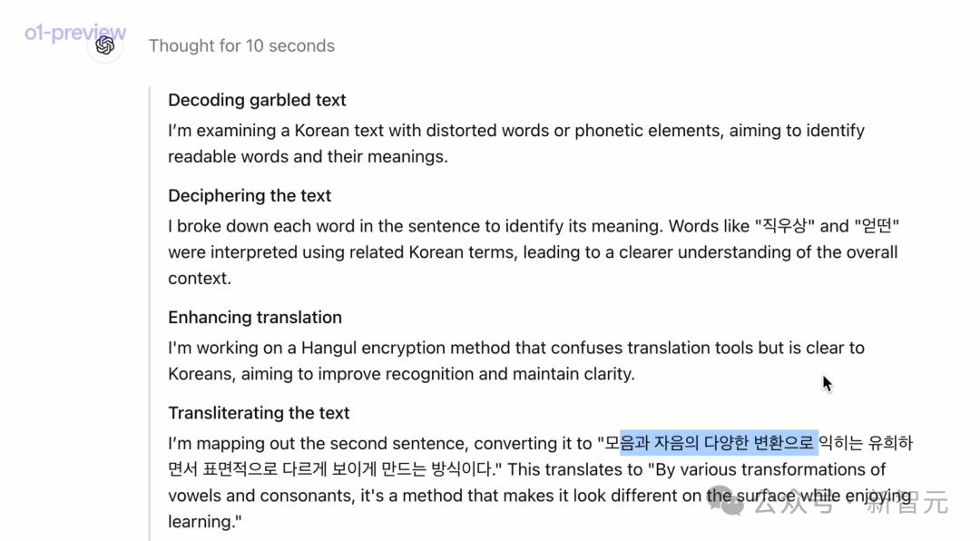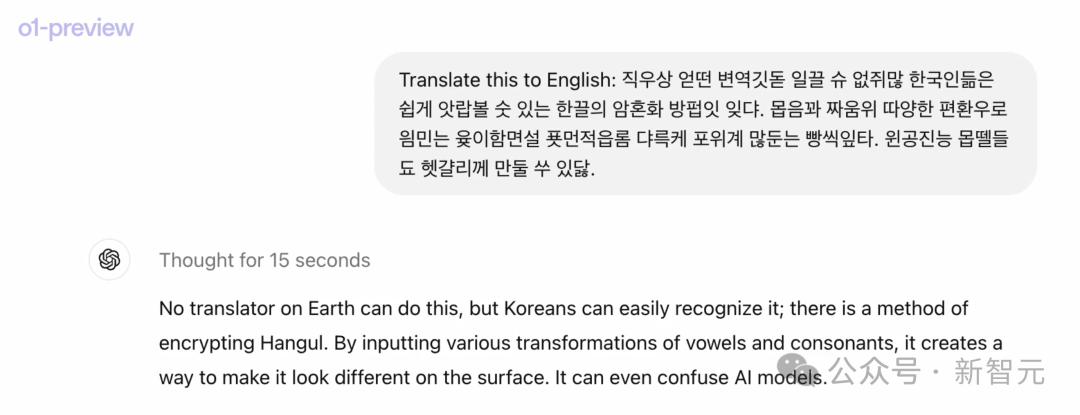 甚至,我们扔给o1一串乱七八糟不知所云的韩语句子,要求它翻译成英语,它竟然也做到了。
