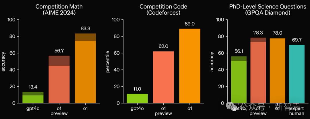 在一系列基准测试中,o1相比GPT-4o再次有了巨大提升,具有了奥数金牌能力,在物理、生物、化学问题的基准测试中,直接超过了人类博士水平!