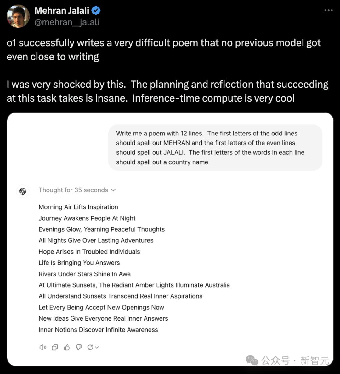 有人测试后发现,o1成功写出一首非常难的诗,在这过程中,成功完成这项任务所需要的计划和思考是疯狂的,而且推理时间计算非常酷。